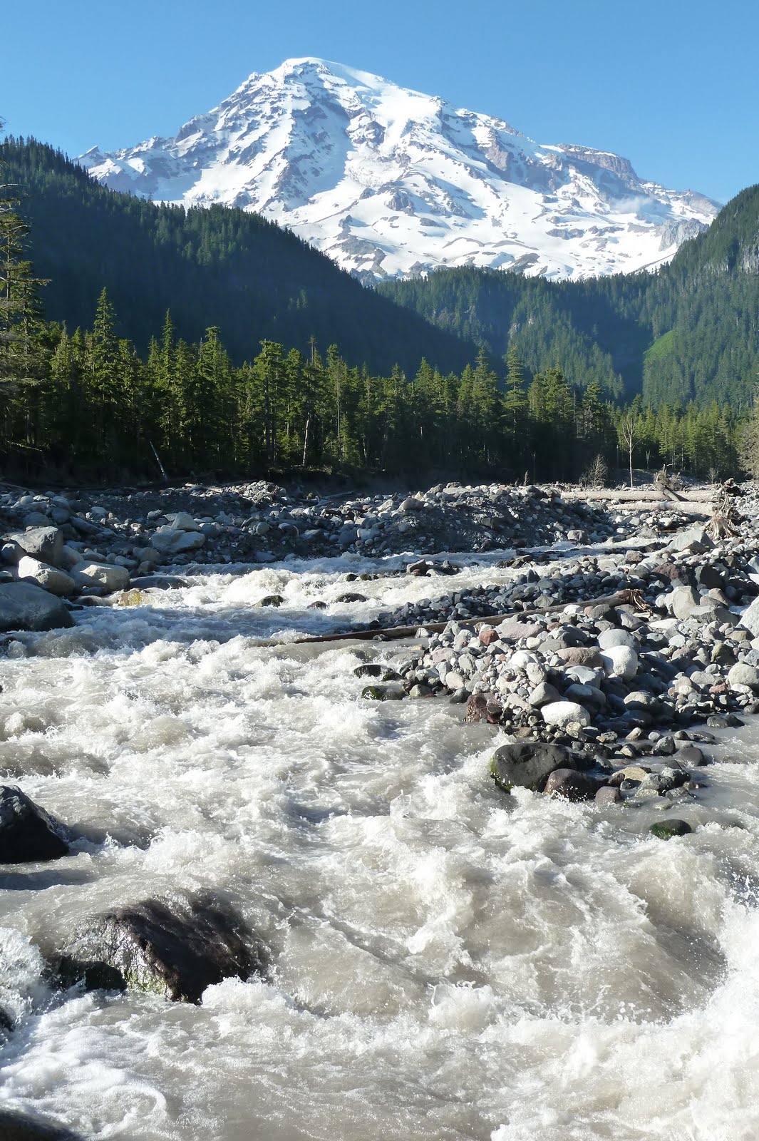 Our hike to Carter Falls, river crossing -with a massive Mt. Rainier in many of our background pictures.