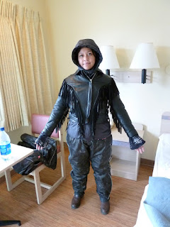 Looking pretty piled on. Outfit includes: Turtleneck wool thermal, long sleeve silk shirt, tie-dye long sleeve cardigan, hooded puff vest, long sleeve insulated jacket liner, fringe leather jacket, woolskins long underwear, slim fit denim jeans, leather chaps, Frog Toggs rain pants and eventually after the picture, an added rain jacket for a grand total of 11 items worn with 7 layers for my upper body!!!! Gotta dress warm for the forecast of Snow! AND yet, i was still FREEZING when we drove through the snowstorm! oops, not including my sports bra and undies... actually 13 items worn! oh, plus heavy duty wool socks!
