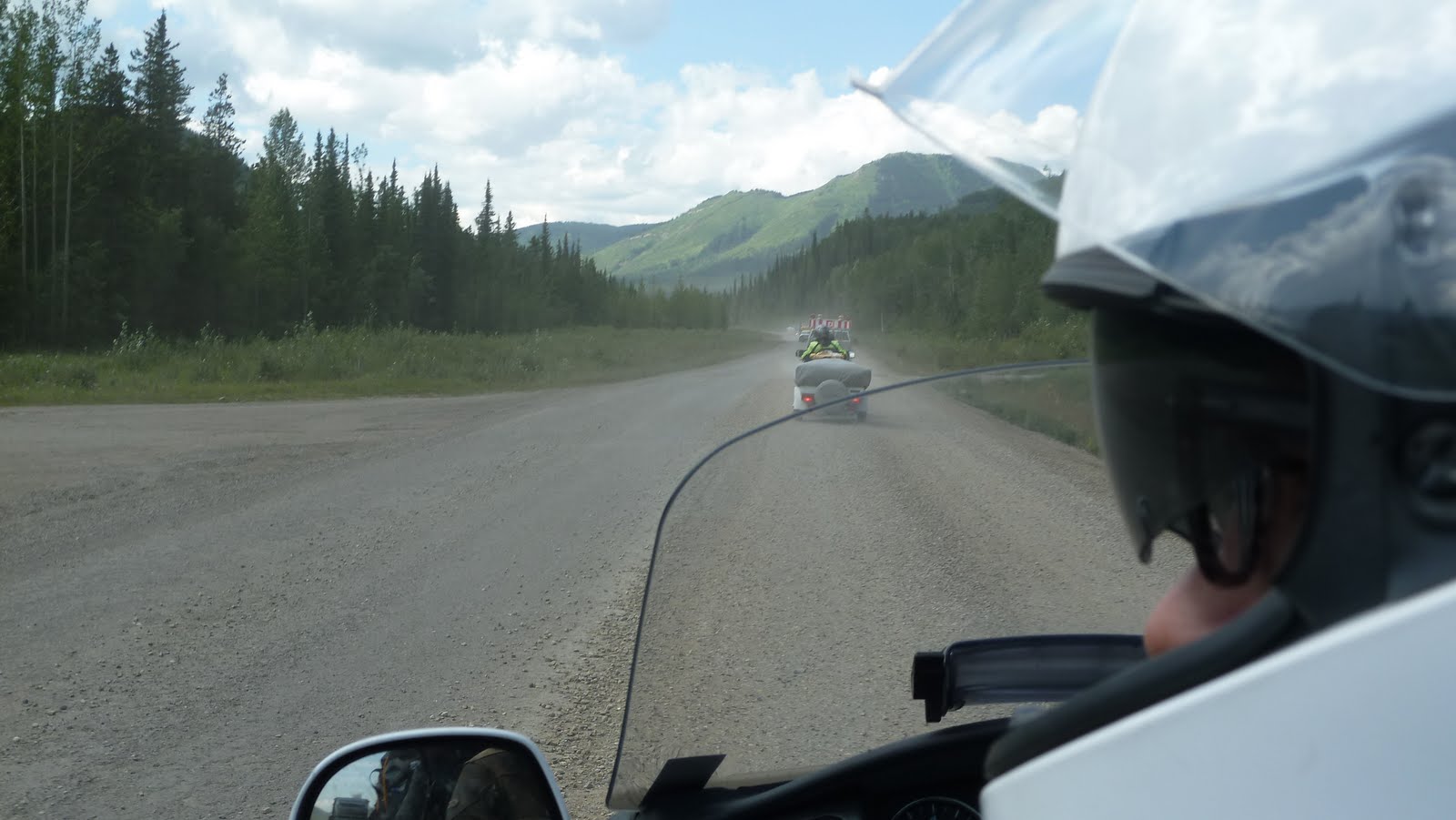 Drive to Fort Nelson following another Goldwing and the pilot car. Dusted and mudded out at the end of construction.