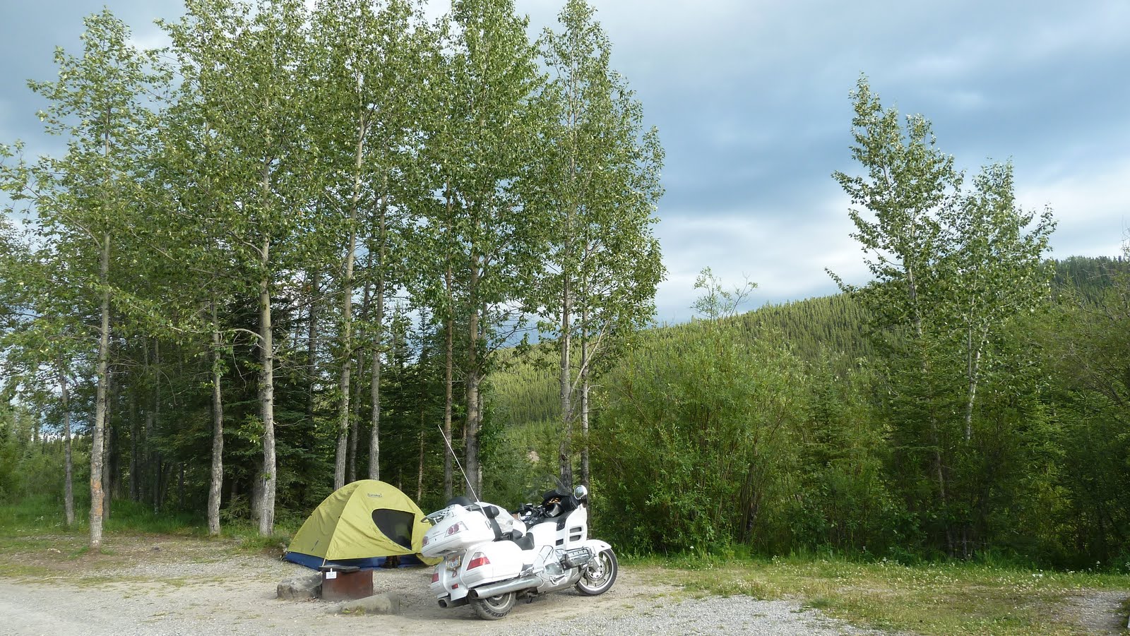 View from our tent of Pearl and a truck carrying fuel off the Alaska Hwy.