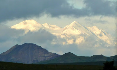 Mt. McKinley/Denali, soaring at 20,320 feet, the highest peak in North America.  The only view we got of the peaks at 7 am.  The rest of the stay, they were shrouded in clouds.