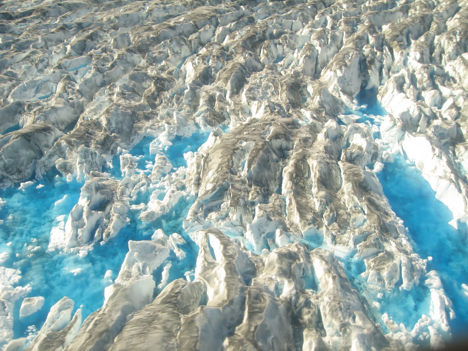 Glacier crevasses with windex blue pools. (The water is so blue because the ice absorbs all the red tones from light and reflects an intensity of blue)