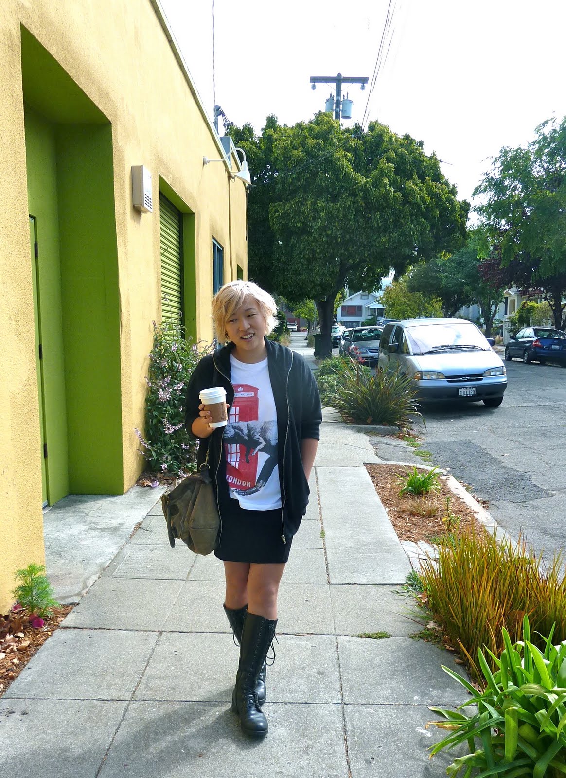 Rae doing the fashion pose-walk on her way to work with her marvelous new 'do!